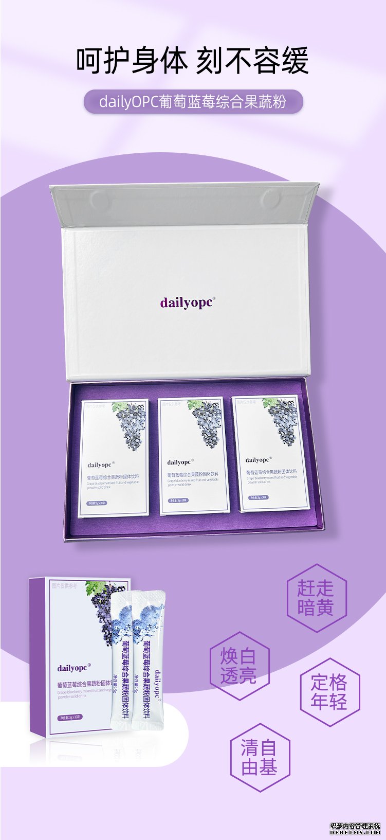 產(chǎn)品簡(jiǎn)介:dailyOPC葡萄藍(lán)莓綜合果蔬粉的主要原料:葡萄籽提取物,藍(lán)莓提取物。其中含有豐富的氨基酸、維生素以及多種礦物質(zhì)等營(yíng)養(yǎng)成分,葡萄籽提取物可有效清除體內(nèi)多余自 由基,具有抗氧化、美容護(hù)膚、緩解過(guò)敏等功效。藍(lán)莓籽具有抗氧化、促進(jìn)新陳代謝等功效。藍(lán)莓籽的營(yíng)養(yǎng)價(jià)值非常廣泛,其中含有氨基酸、維生素、鈣離子、礦物質(zhì)以及黃酮類(lèi)等多種營(yíng)養(yǎng)元素。
